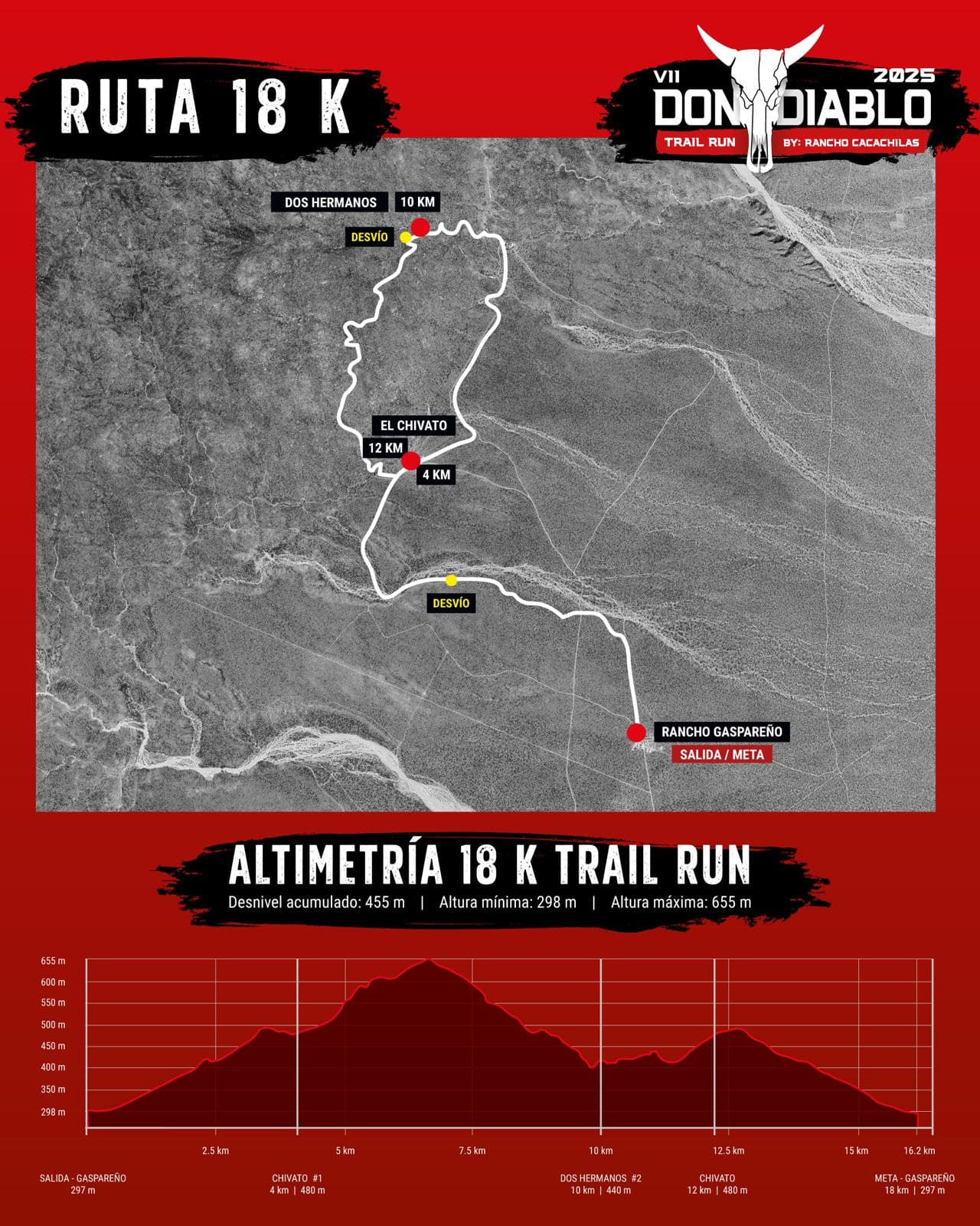 La salida y la meta de la carrera comenzarán en “Gaspareño”, el primer punto de encuentro del Rancho, después de haber entrado desde la carretera La Paz-Los Planes en Baja California Sur ver mapa. En este espacio, se ubican nuestros huertos, cuarto de monturas y el espacio donde resguardamos a nuestras mulas, en esta área podremos encontrar distintas actividades para las y los acompañantes, así como venta de comida, bebidas y mercancía oficial Don Diablo.